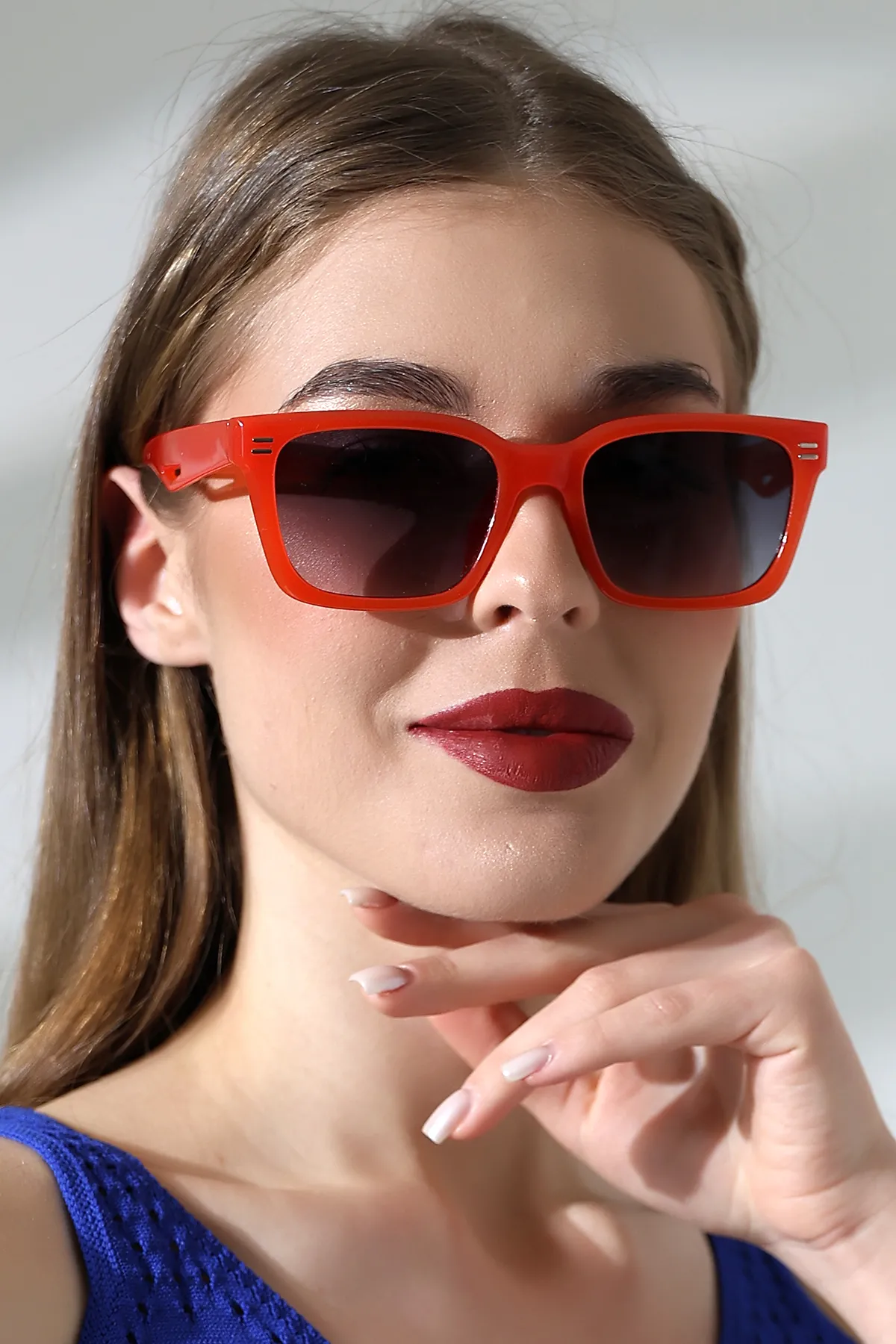 Kadın Aksesuarlı Kare Kırmızı Koyu Renk Cam Güneş Gözlüğü 23002-1 C9 K